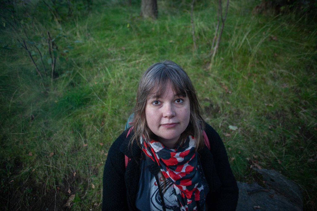 Ett ansikte mitt i staden, ser lite förvånad, kanske nästan lite sur ut,