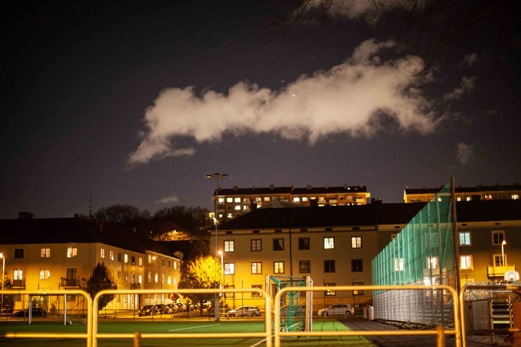 Moln över Grönavallen, kvällsbild i förgrunden lägre staket sedan plast-gräsplanen och i bakgrunden hus där vissa fönster har tänt sina lampor.