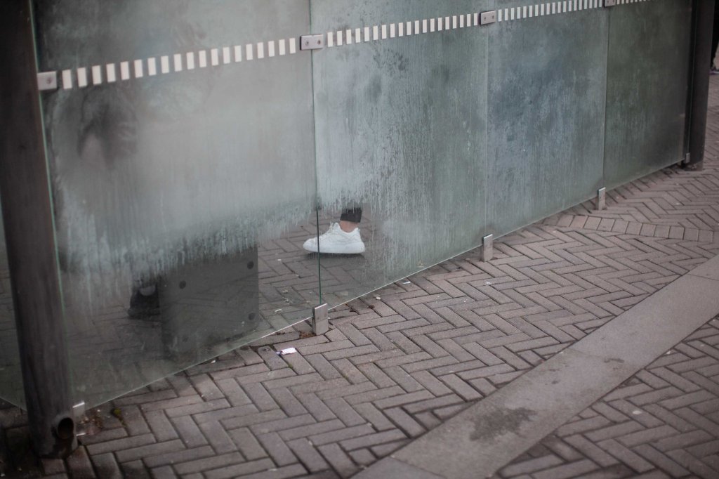 Feet in shoe at the tram stop. Street photography in Gothenburg.