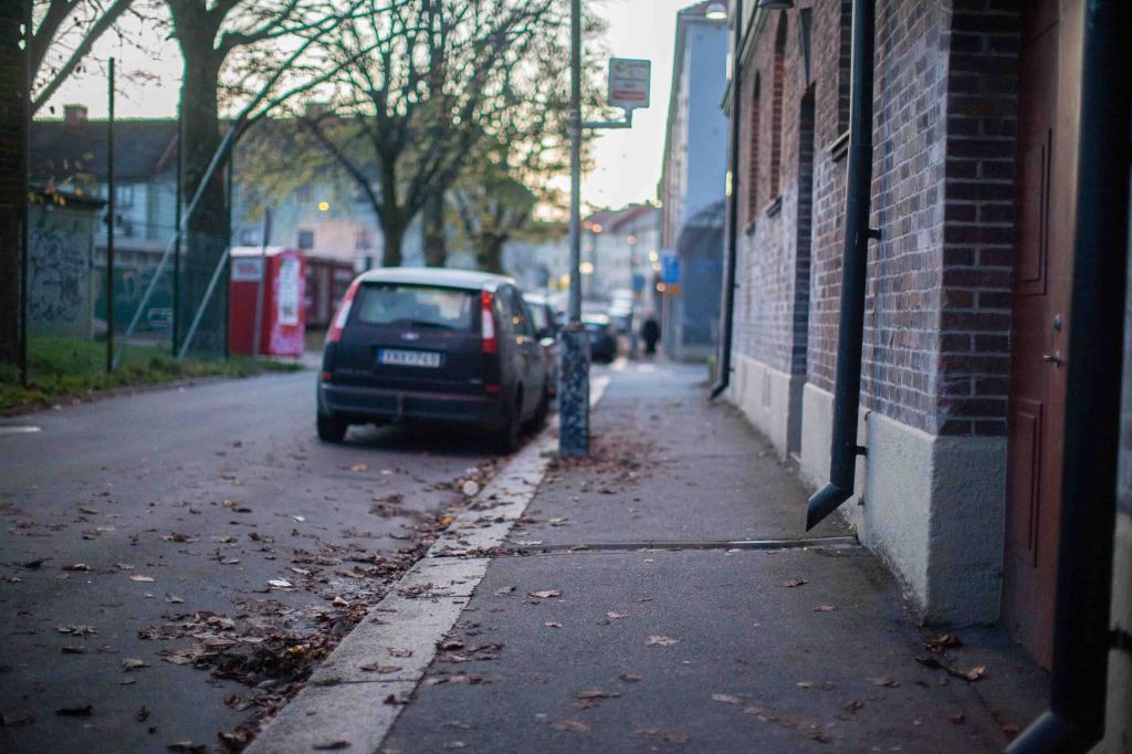 A street with cars, leafs on the ground on the right-hand side brick wall of a landshövdingehus (https://en.wikipedia.org/wiki/Landsh%C3%B6vdingehus)