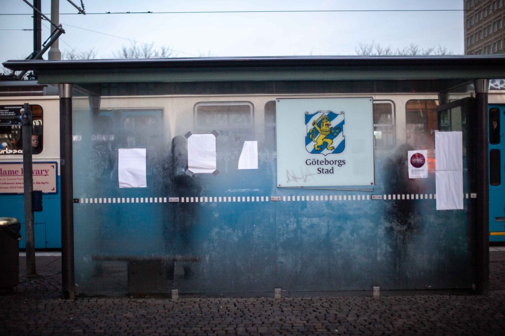 The tram stop at Järntorget, frosty glass makes the people waiting for the tram to become blurry. Street photography, Gothenburg