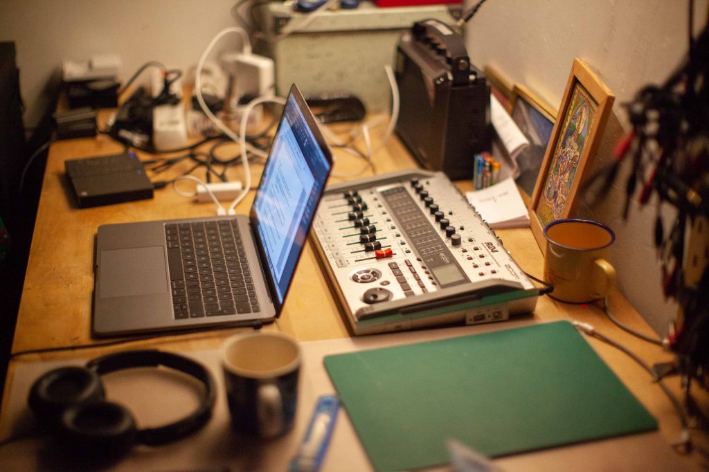 2018-01-28, Arbetsplats. Här jobbar jag mestadels med min dator som redskap men även med inspelare/ mixern ZOOM R24. En digital portastudio där en har åtta ingångar varav upp till 6 kan ha fantommatning, som är värt mycket när jag arbetar med ljudverk.