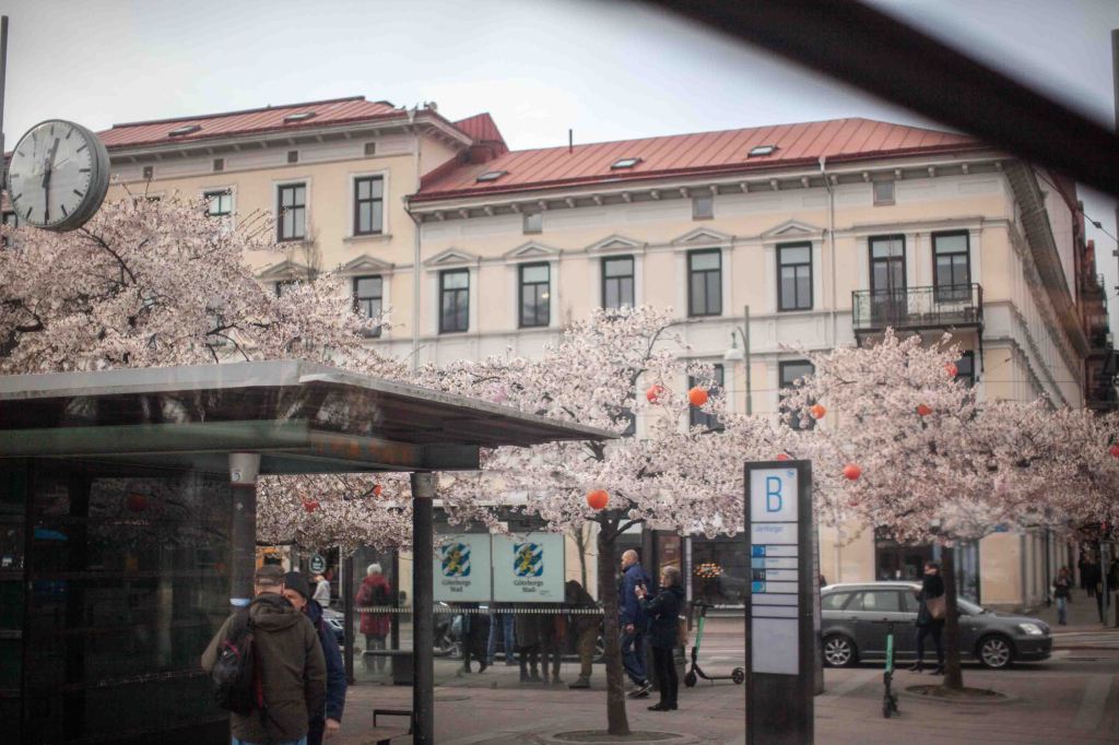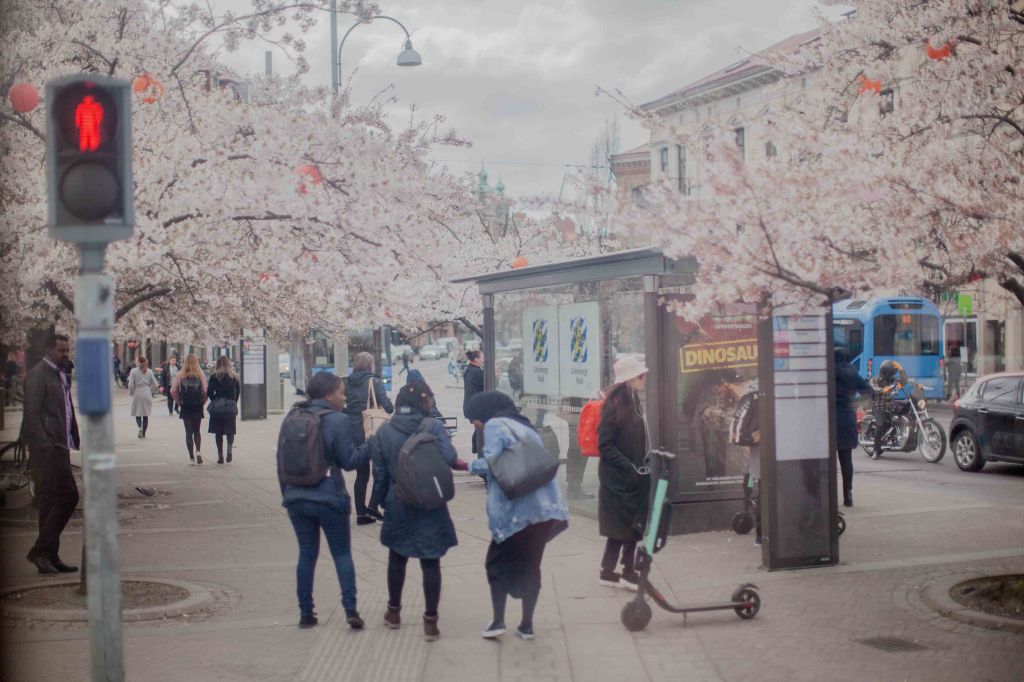 Brunnsparken, photo from the tram, people walking some are standing waiting for…