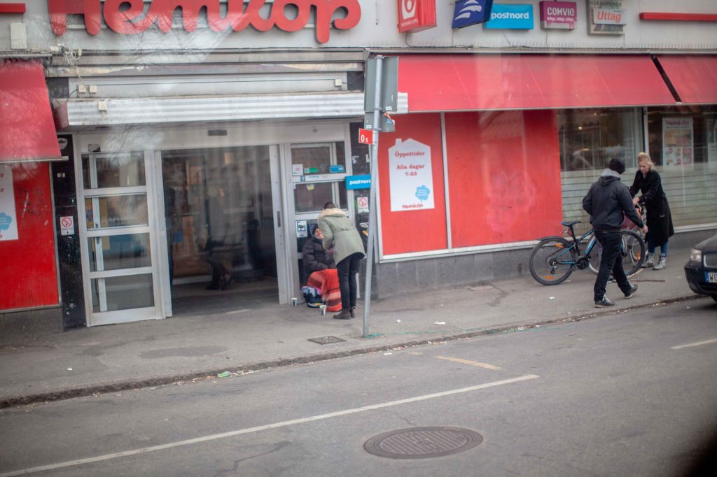 The tram stop at Järntorget, frosty glass makes the people waiting for the tram to become blurry. Street photography, Gothenburg