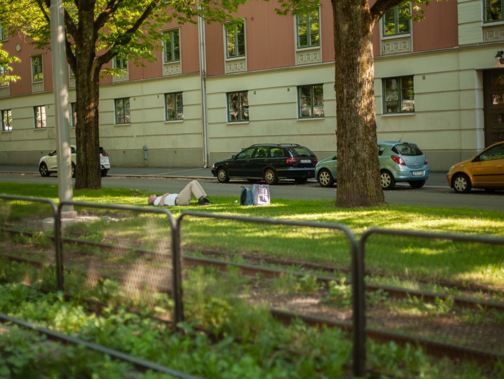 2018-06-05, Göteborg. Ytterligare en dag har gått, en man ligger och vilar på banvallen (eller inte riktigt men det är en gräs-yta som delar spårvagnsspåren och bilvägen) på/ vid Älvsborgsgatan. Ett paket som kommit från någon.