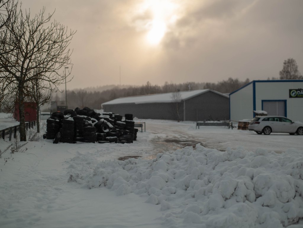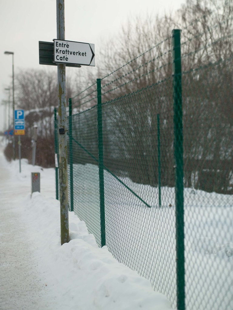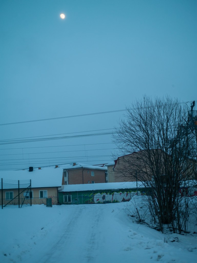 Clouds over Gröna Vallen, evening image in the foreground lower fence then the plastic lawn and in the background houses where some windows have turned on their lights.